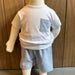 T-shirt in witte hoge kwaliteit jersey. Shortje en zakje in prachtige blauwe Italiaanse jersey.
