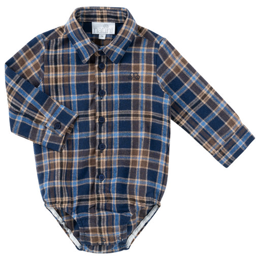 NatiniGeruit flanellen bodyhemd met de kleuren blauw, beige en bruin. Een bodyhemdje doe je het gemakkelijkst aan van onder naar boven, dus eerst de bene...