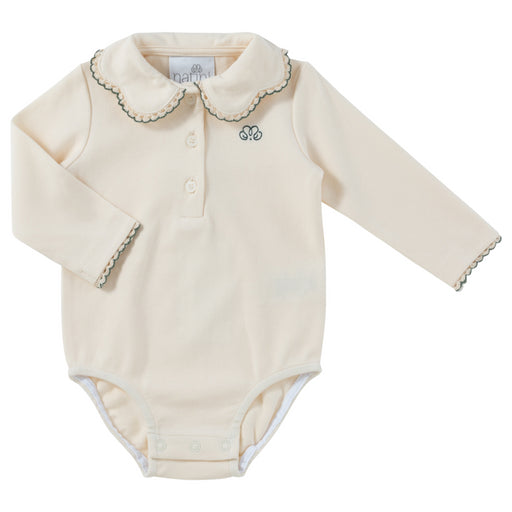 NatiniCrèmekleurige katoenen body met groene broderie afwerking aan de kraag en uiteinde van de mouwen. De top heeft 3 knopen vooraan en een groen gebord...