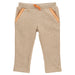 Beige melange joggerbroek gemaakt uit , afgewerkt met oranje en crème. De jogger heeft twee zakjes vooraan en twee achteraan. In de taille is er een oranje koordje om de broek aan te passen. Kan mooi gecombineerd worden met de bijpassende sweater, T-shirt of polo.