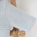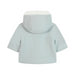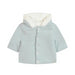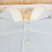 Deze gebreide jas voor pasgeboren jongens in gemêleerd hemelsblauw valt op door zijn capuchon, gevoerd met zachte en comfortabele imitatiebont. Gebreid in een gerstekorrelsteek, wordt hij gesloten met fijne, elegante knoopjes. Een stijlvol en warm model, perfect voor de eerste koude dagen.