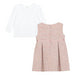 Stylish two-piece girl's outfit featuring a sleeveless pink tweed dress with a subtle shimmer, a fitted bodice, a pleated skirt, and a coordinating long-sleeved white jersey top with a rounded collar.