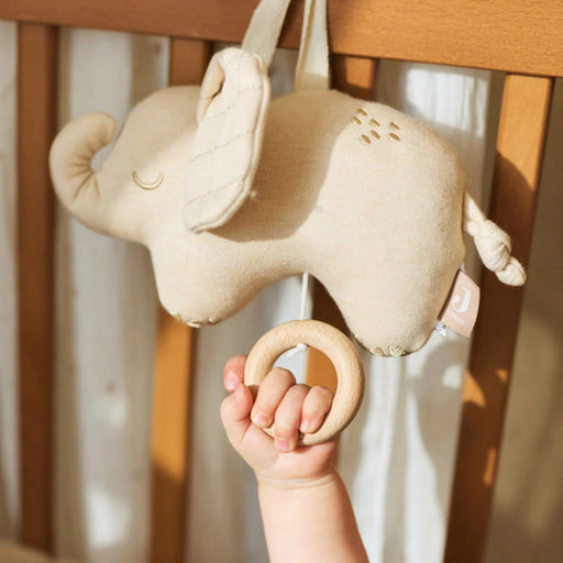 Deze lieve mini-muziekknuffel van Nattou in de vorm van een zandkleurig olifantje is het perfecte vriendje voor je baby. Trek aan het zachte bloem...