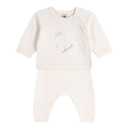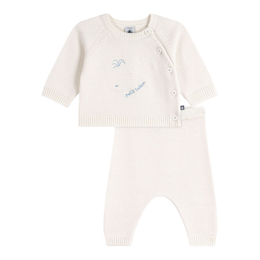 Alle gegevens bekijkenPetit Bateau - Tweedelig gebreid babysetje van wol en katoen met walvismotiefje