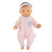Bébé Calin Mila draagt een roze pyjama met een bloemenkraagje in Claudine-stijl en een bijpassende haarband.
