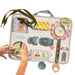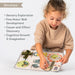 Onze Snap ‘n Learn Board is een interactief speelgoed voor peuters vanaf 18 maanden. Het bevat veters om te leren strikken met een kiekeboe-beer, een draaiende ontdekschijf met een kiekeboe-bloem en eekhoorn, en een draaislot dat een kiekeboe-vlinder onthult. De centrale gesp helpt peuters bij het oefenen van motorische vaardigheden en het ontdekken van geluidseffecten. Daarnaast bevorderen de rits met een blaadje en de schuivende kiekeboe-drukknop de motoriek en het begrip van oorzaak en gevolg.