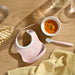 De stevige kom ligt prettig in de hand, waardoor je met je ene hand kunt voeden terwijl je met de andere het kommetje stabiel vasthoudt. De bijgeleverde lepel heeft een lange steel en een zachte, afgeronde schep – ideaal voor kleine mondjes én om als ouder gemakkelijk te voeren. Het bijpassende slabbetje heeft een zachte halslijn en een knoeizakje dat morsen opvangt voordat het de kleertjes bereikt.