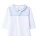 Babypakje van 100% katoenen jersey met borstpas en voetjes in seersuckerstof. Stoffen pas op de voetjes en kraag. Sluit met verborgen drukknopen aan de voorkant en tussen de benen.